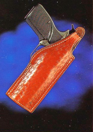 A high riding holster wet moulded to fit all large pistols and revolvers. suede lined for gun protection and a fast snag free draw.
