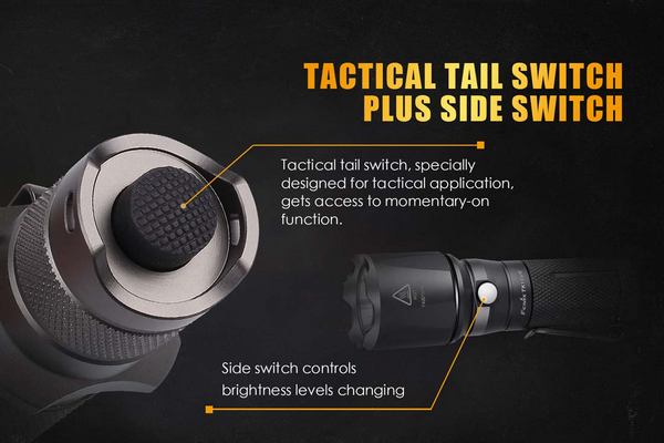 enforcement, search and rescue, military and more. Size: Length: 5.6” (142.5mm) Body: 1.0” (25.4mm) Head: 1.3” (34mm) Weight: 5.0 oz. (141g) excluding batteries Batteries: One 18650 rechargeable Li-ion battery or two CR123A Lithium batteries Included: Holster, lanyard, spare O-ring, spare rubber switch boot Warranty: Limited Lifetime Guarantee from Fenix Lighting U.S. *Due to intelligent over-heat protection, the runtime of the Turbo brightness level is the accumulated time. Uses Cree XP-L HI V3 LED with a life span of 50,000 hours Compatible with AER-01/AER-02 remote pressure switch Digitally regulated output maintains constant brightness Reverse polarity protection, to protect from improper battery installation Anti-roll and anti-slip body design Tactical tail switch for momentary-on function Functional side switch for output selection Made of durable aircraft-grade aluminum Premium type Ⅲ hard-anodized anti-abrasive finish Toughened ultra-clear glass lens with anti-reflective coating |